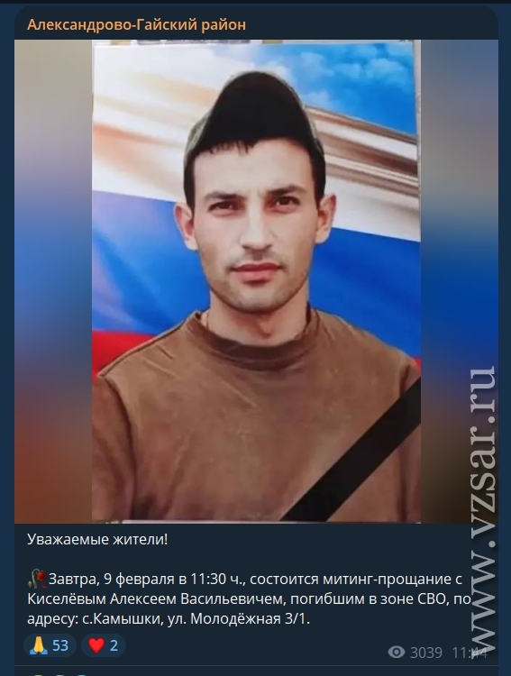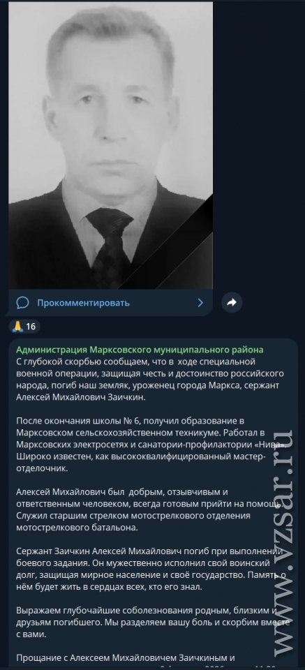 Администрация Марксовского района сообщает о гибели сержанта Алексея Заичкина.