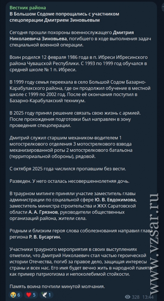 Базарно-Карабулакское издание "Вестник района" рассказало о состоявшемся прощании с Дмитрием Зиновьевым.