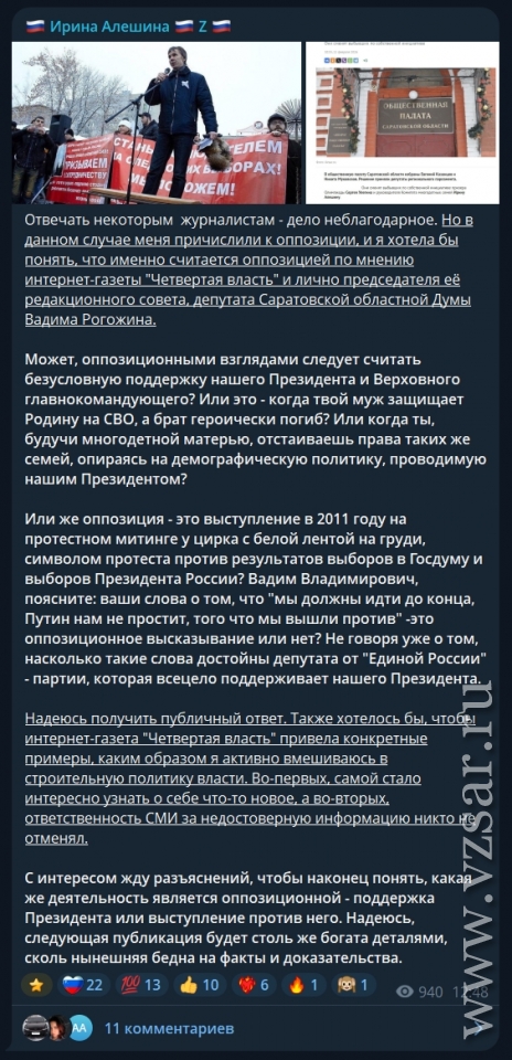 Сегодня глава Комитета многодетных семей Ирина Алешина выступила с публичной отповедью в адрес интернет-газеты "Четвертая власть" и председателя ее редсовета, депутата Саратовской облдумы ("ЕР") Вадима Рогожина.