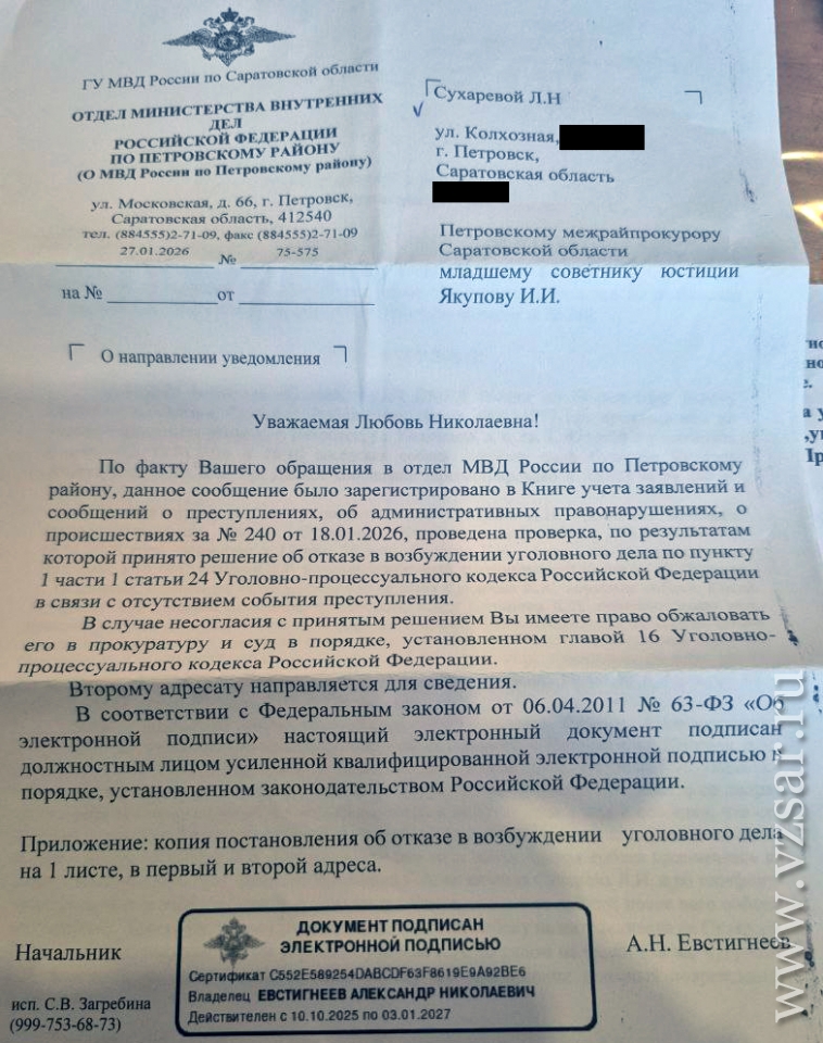 В редакцию ИА "Взгляд-инфо" обратилась жительница Петровска Саратовской области Любовь Сухарева. Она рассказала о том, что в январе ее 7-летний сын пострадал в результате нападения собаки; ребенок получил серьезные травмы, но полиция отказалась возбуждать уголовное дело.