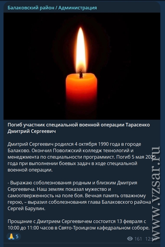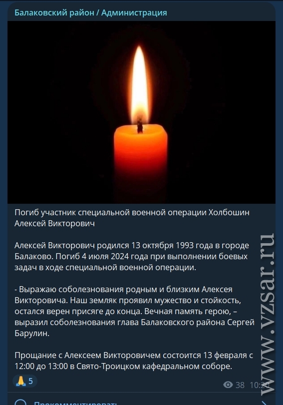 Администрация Балаковского района рассказала, что завтра состоится прощание с погибшими Дмитрием Тарасенко и Алексеем Холбошиным.