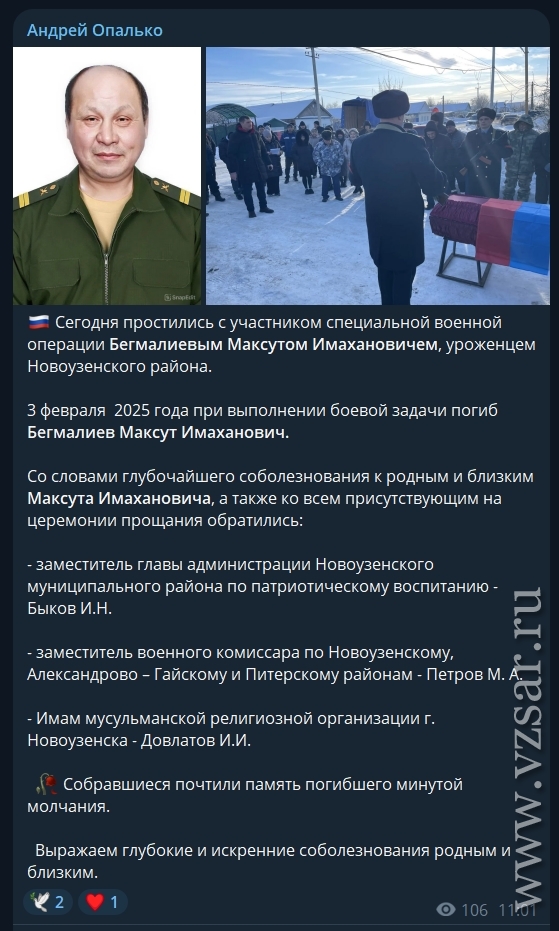 Глава Новоузенского района Андрей Опалько рассказал о прошедшем сегодня прощании с погибшим 3 февраля 2025 года Максутом Бегмалиевым.