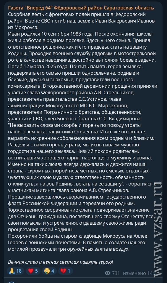 Газета "Вперед 64" Федоровского района рассказала о прошедшем в поселке Мокроус прощании с погибшим Иваном Ивановым.