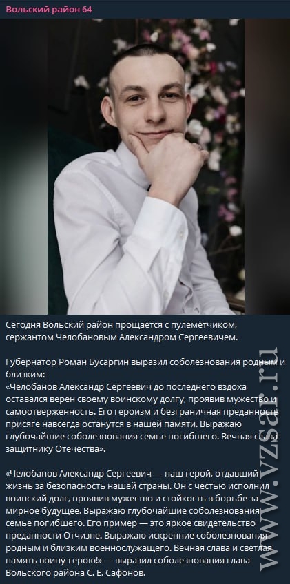 Сегодня в Вольске проводили в последний путь сержанта Александра Челобанова. Александр Сергеевич служил пулеметчиком и погиб в зоне СВО. Его отпели в вольском Троицком соборе.