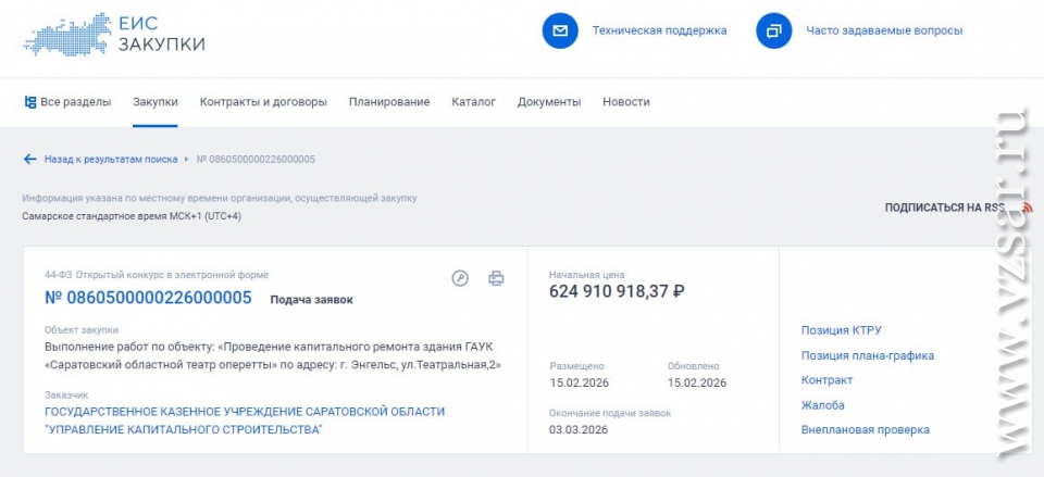 Вчера (в воскресенье) ГКУ Саратовской области "Управление капитального строительства" объявило конкурс на выполнение работ по капитальному ремонту областного театра оперетты, расположенного в Энгельсе.