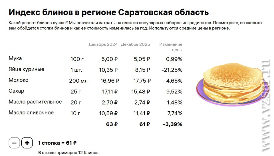 Наибольшее изменение цены на порцию из 12 блинов имеет место в Пензенской области - на 5,81%, (до 56 рублей).