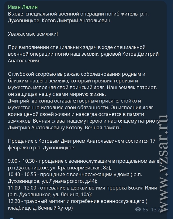 Также глава администрации Духовницкого района Иван Лялин рассказал, что завтра в райцентре пройдет прощание с Дмитрием Котовым.