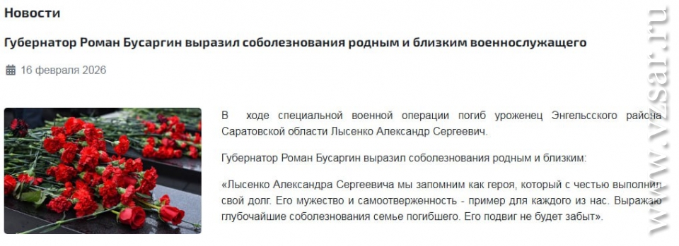 Администрация Саратова без подробностей сообщила о гибели Владимира Савочкина, а администрация Энгельсского района о гибели Александра Лысенко.