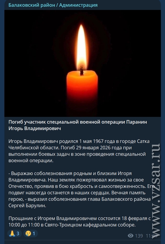 Администрация Балаковского района рассказала, что завтра пройдет прощание с Игорем Параниным, который родился 1 мая 1967 года в городе Сатка Челябинской области, а погиб 29 января этого года при выполнении боевых задач в зоне проведения СВО.