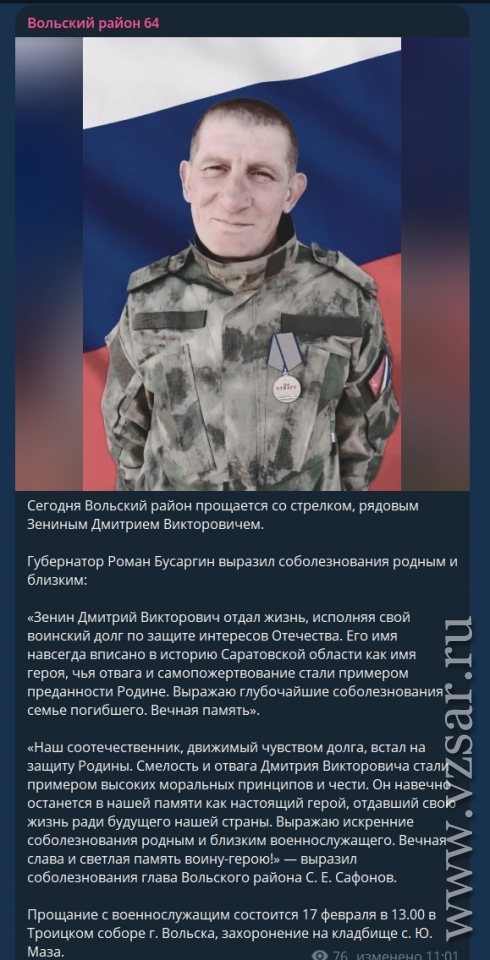Администрация Вольского района сообщила, что сегодня проводили в последний путь Дмитрия Зенина и Дмитрия Христачева.