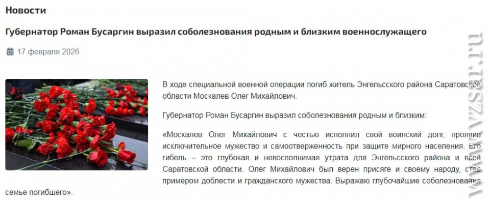 Администрация Энгельсского района без подробностей сообщила о гибели Олега Москалева.