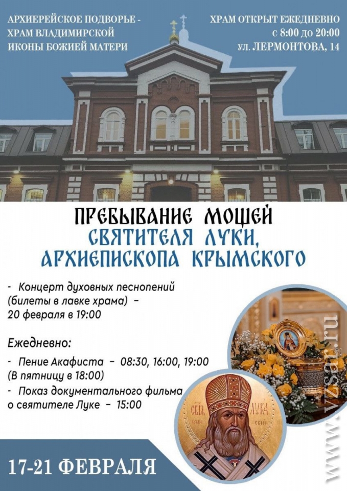 С сегодняшнего дня в храме в честь Владимирской иконы Божией Матери города Саратов (ул. Лермонтова, 14) будет пребывать ковчег с частицей мощей святителя Луки Крымского.