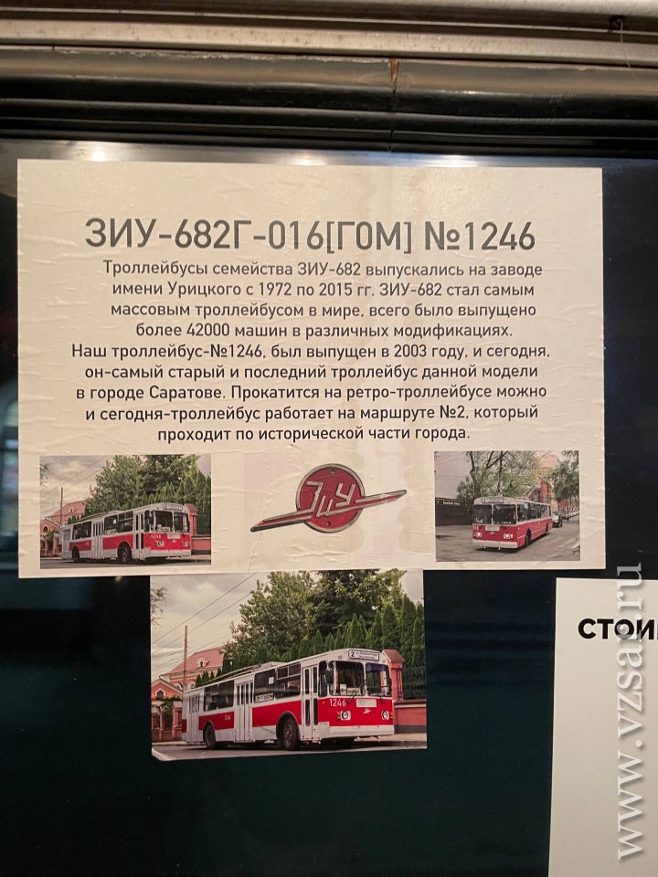 "Массово троллейбусы этой модели ходили в Саратове с 1972 по 2019 года. Под конец массовой эксплуатации их было в районе 40 машин. С 2019 по 2026 год ходил "музей на линии" - бортовой № 1246, известный "житель" маршрутов №№ 2 и 2А.