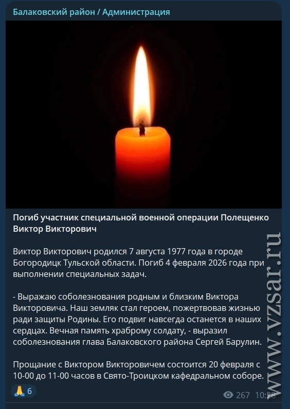 Администрация Балаковского района рассказала, что в пятницу 20 февраля пройдет прощание с Виктором Полещенко.