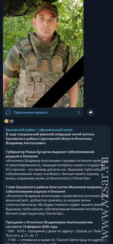 Администрация Ершовского района рассказала о сегодняшнем прощании с Владимиром Игнатенко.