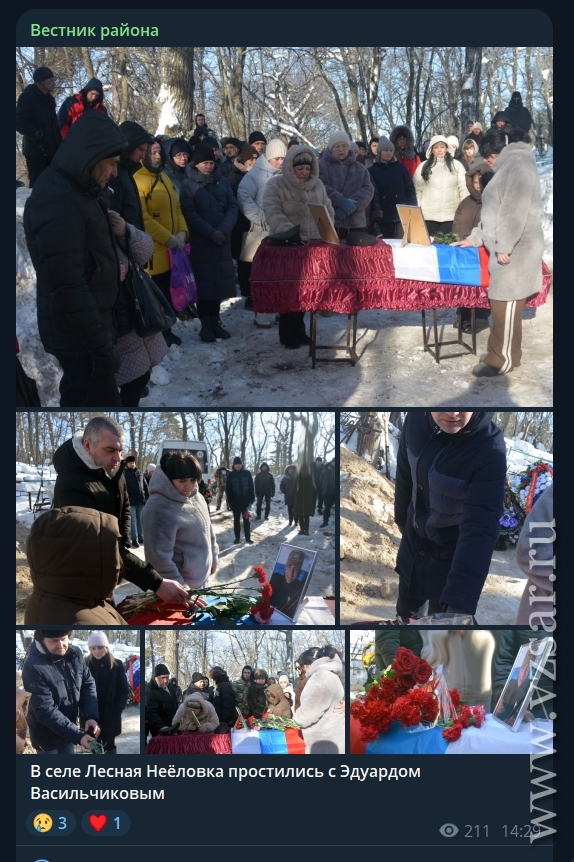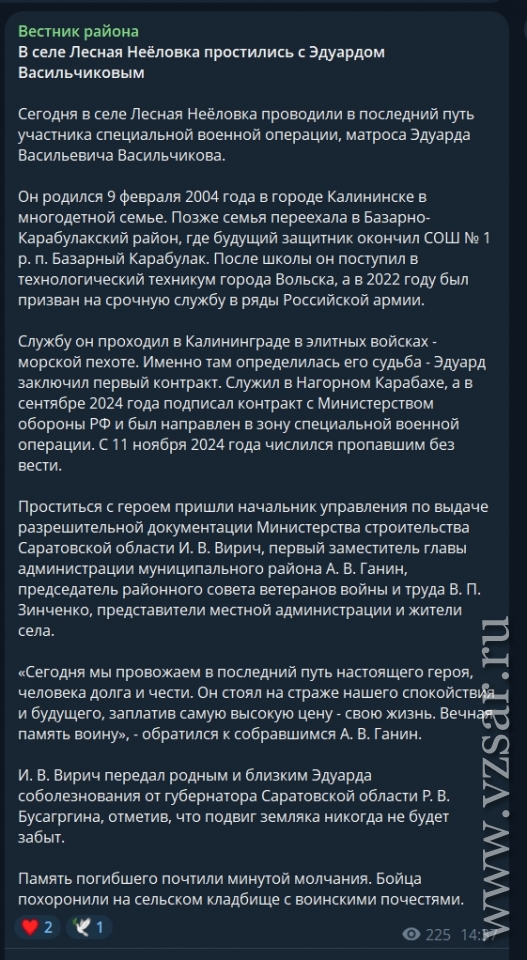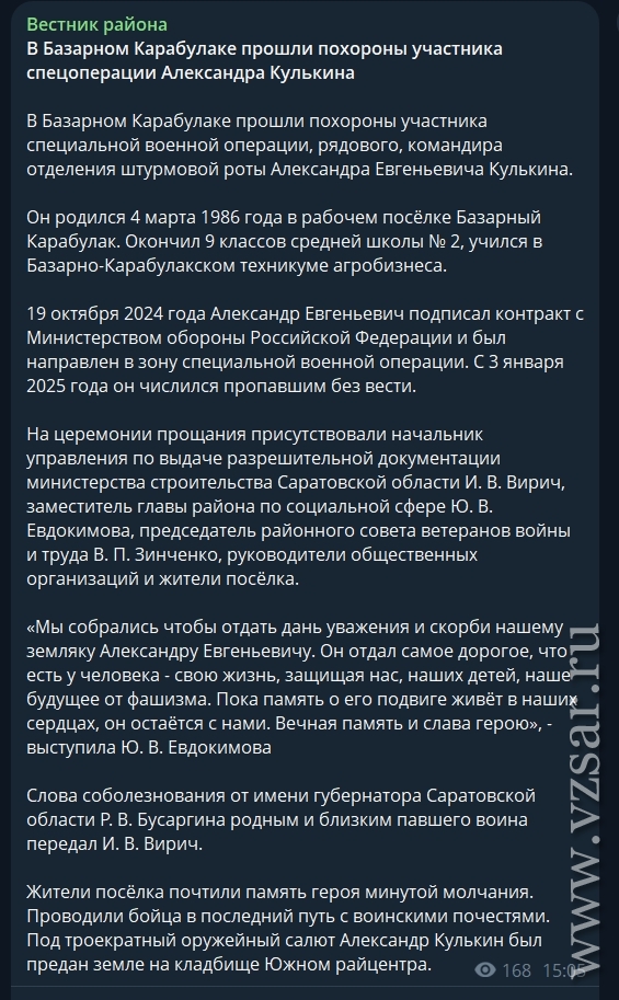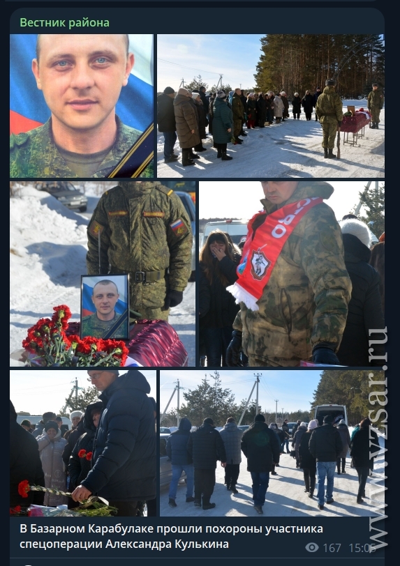 Базарно-Карабулакское издание "Вестник района" рассказало о прошедшем сегодня в райцентре прощании с командиром отделения штурмовой роты Александром Кулькиным, а в селе Лесная Нееловка – с погибшим матросом Эдуардом Васильчиковым.
