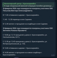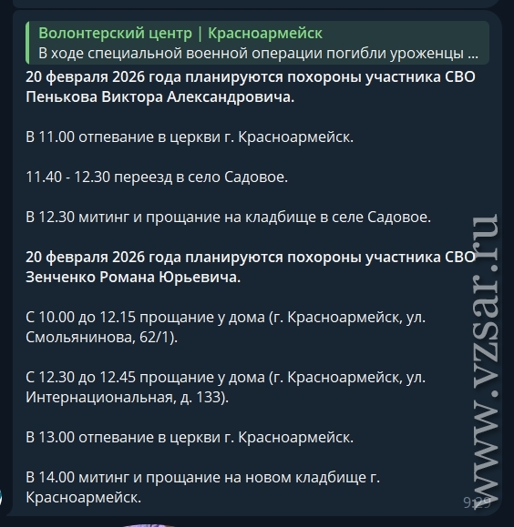 Муниципальный волонтерский центр Красноармейска сообщает, что завтра в городе простятся с погибшим Романом Зенченко, а в селе Садовое – с Виктором Пеньковым.