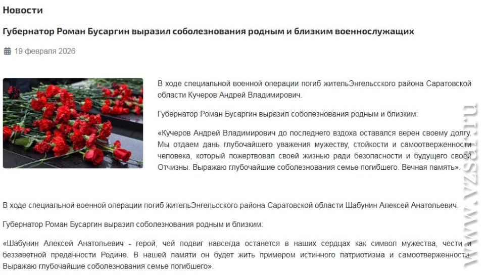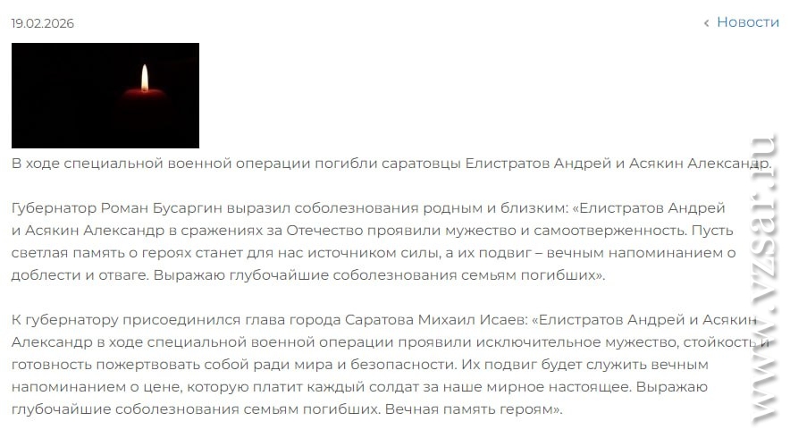 Администрация Саратова без подробностей сообщила о гибели Андрея Елистратова и Александра Асякина, а администрация Энгельсского района – о гибели Андрея Кучерова и Алексея Шабунина.