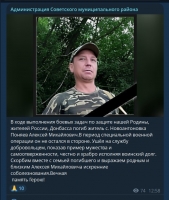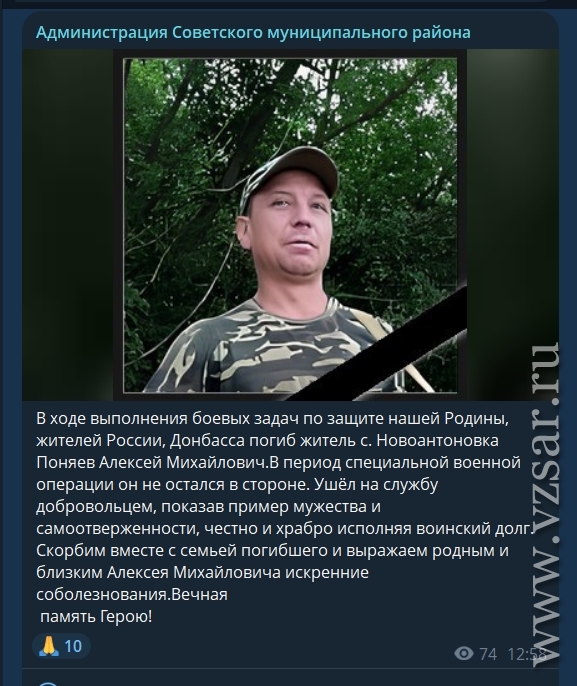 Администрация Советского района сообщила о гибели добровольца, жителя села Новоантоновка Алексея Поняева.