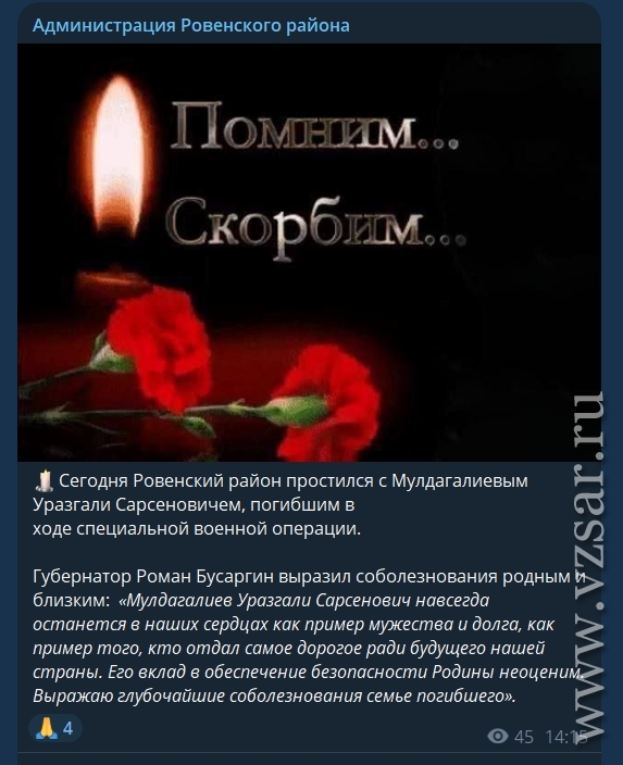 Администрация Ровенского района коротко сообщила о сегодняшнем прощании с погибшим Уразгали Мулдагалиевым.