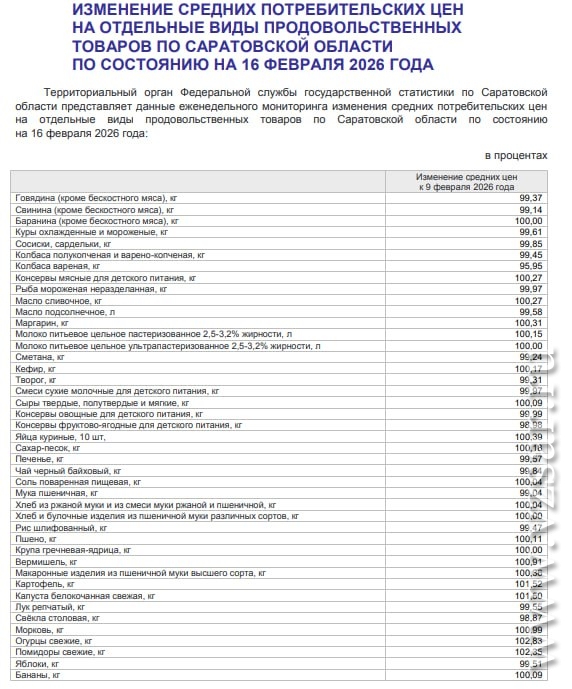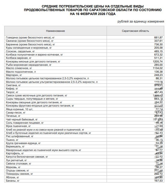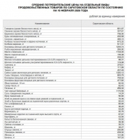 На 16 февраля средняя цена сахара-песка в регионе составляла 62,42 руб./кг, муки – 50,94 руб./кг, десятка яиц – 82,54 руб., масла подсолнечного – 136,38 руб./л, масла сливочного – 1134,02 руб./кг, сметаны – 379,51 руб./кг, кур охлажденных и мороженых – 205,58 руб./кг, капусты – 33,52 руб./кг, свеклы – 35,74 руб./кг, лука – 39,36 руб./кг, картофеля – 43,94 руб./кг, макарон – 87,67 руб./кг, огурцов – 250,8 руб./кг, помидоров – 239,32 руб./кг, бананов – 167,53 руб./кг.