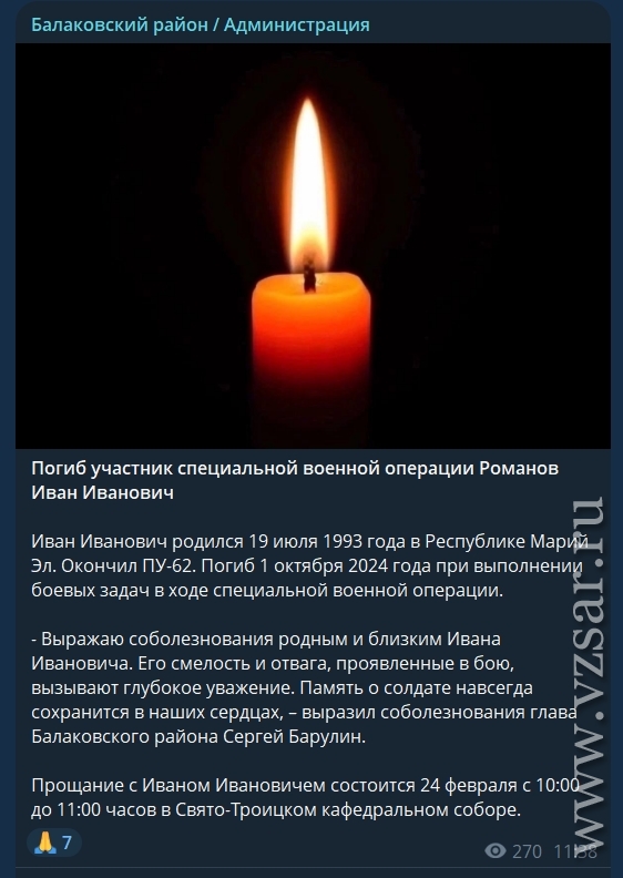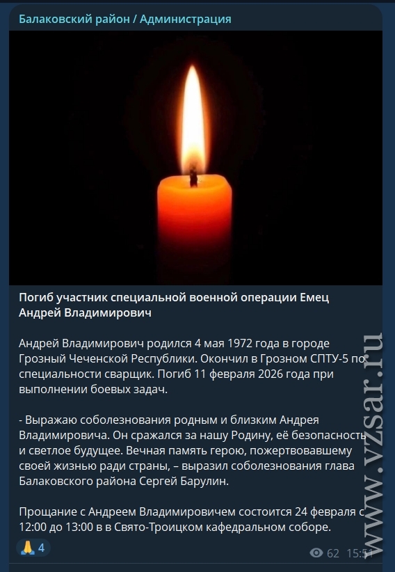 Администрация Балаковского района рассказала, что во вторник 24 февраля пройдет прощание с Иваном Романовым и Андреем Емецом.