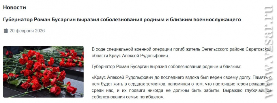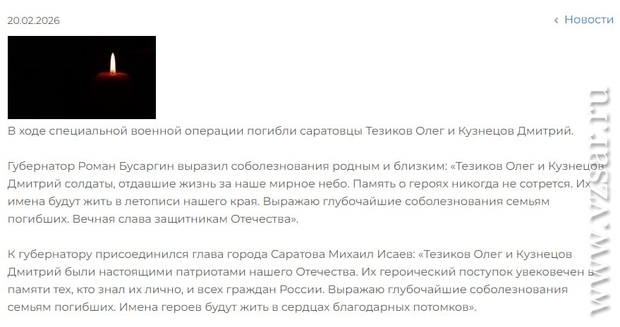 Администрация Саратова без подробностей сообщила о гибели Олега Тезикова и Дмитрия Кузнецова, а администрация Энгельсского района – о гибели Алексея Крауса.