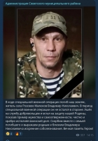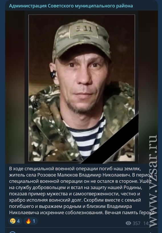 Администрация Советского района сообщила о гибели добровольца, жителя села Розовое Владимира Малюкова.