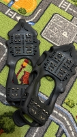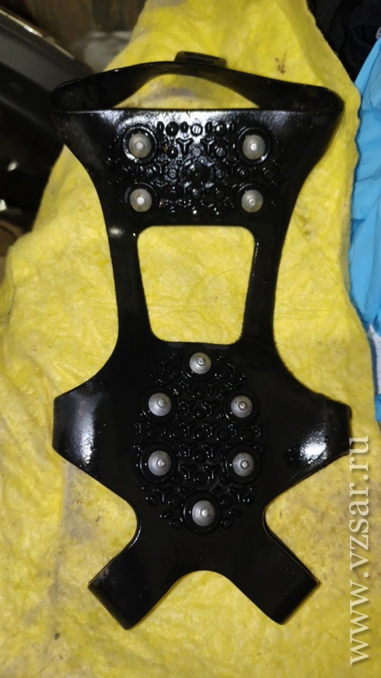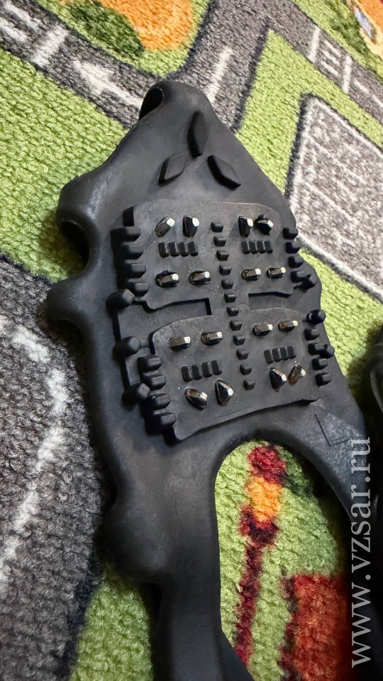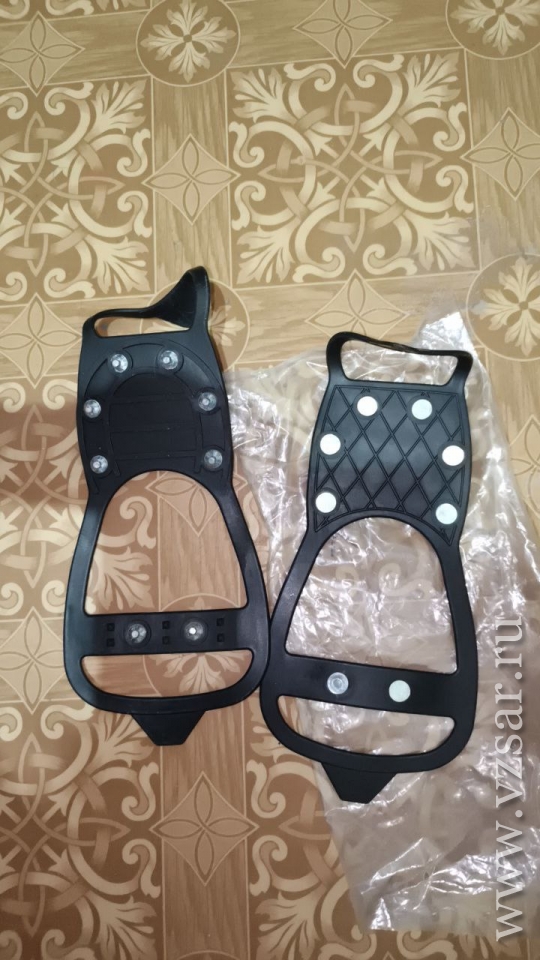 Фото своих ледоступов прислала читательница Ирина. Она отметила, что пользуется устройствами с 10-ю шипами на каждой подошве: