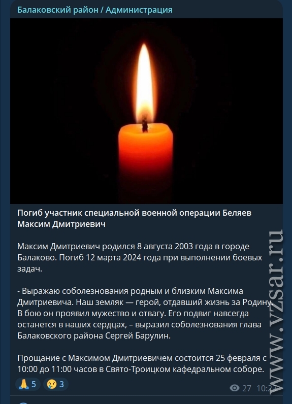 Завтра в Балаковском районе пройдет прощание с Максимом Беляевым, сообщает местная администрация.
