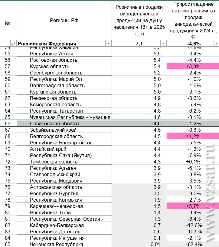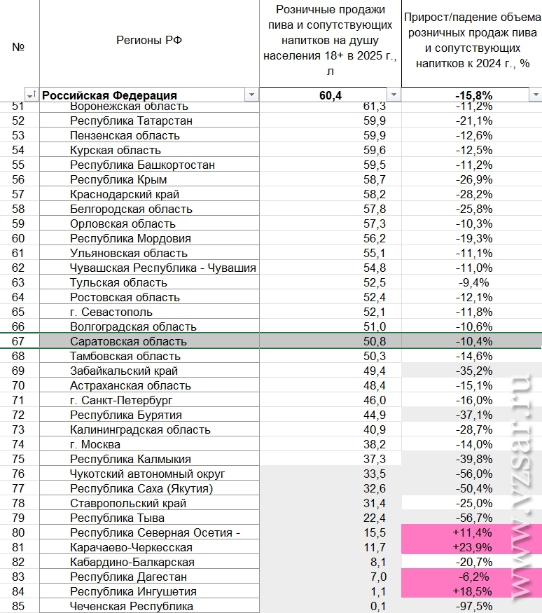 Что касается потребления крепкого алкоголя, то по этому параметру Саратовская область признана одним из самых трезвых субъектов страны (76-е место из 85): за год на душу населения в регионе было приобретено 7,1 литра горячительного, что, правда, больше показателя 2024 года на 2,5%.