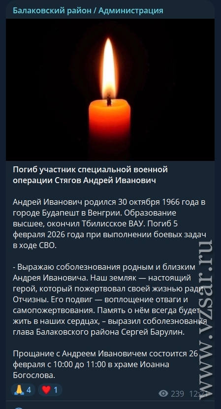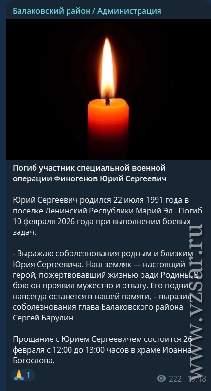 Администрация Балаковского района рассказала, что завтра пройдет прощание с Андреем Стяговым и Юрием Финогеновым.