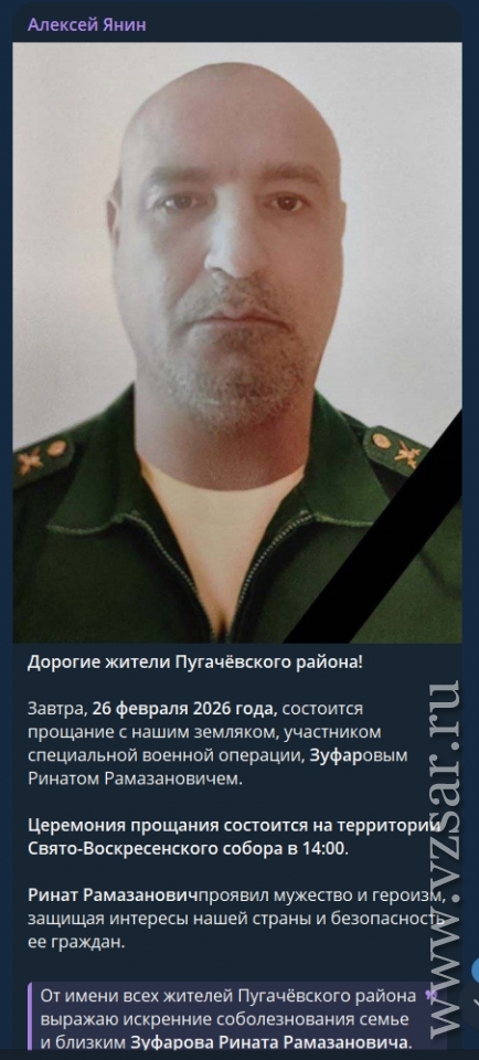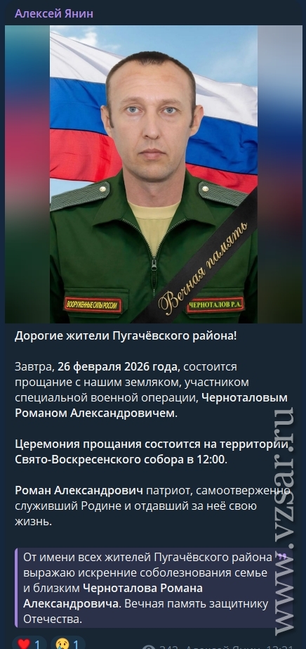 О гибели Романа Черноталова и Рината Зуфарова сообщает глава Пугачевского района Алексей Янин, а о погибшем Эдуарде Швачунове – администрация Энгельсского района.