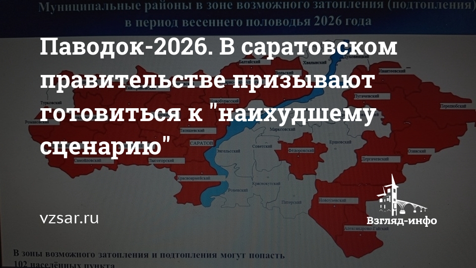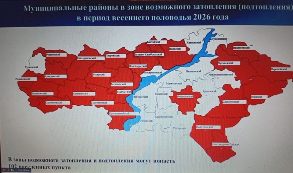 В нынешнем паводковом сезоне в зону затопления могут попасть 102 населенных пункта Саратовской области. Об этом на проходящем в эти минуты заседании облправительства сообщил начальник управления региональной безопасности Юрий Юрин.