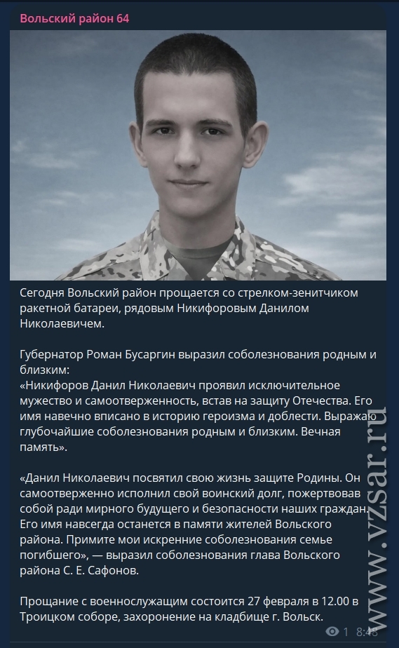 Администрация Вольского района сообщает, что сегодня состоится прощание со стрелком-зенитчиком ракетной батареи, рядовым Данилом Никифоровым.