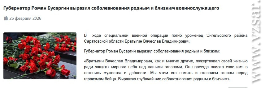 Также в ходе специальной военной операции погиб уроженец Энгельсского района Вячеслав Братыгин, сообщает райадминистрация.