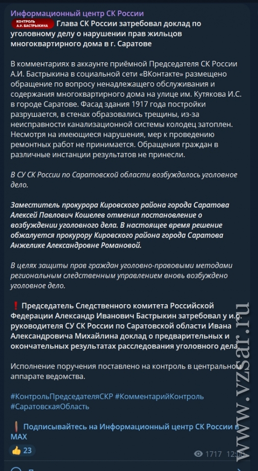 На этот раз через приемную Бастрыкина в соцсети "ВК" к руководителю Следкома обратились обитатели МКД на улице Кутякова в Саратове. Они пожаловались на ненадлежащее обслуживание и содержание дома.