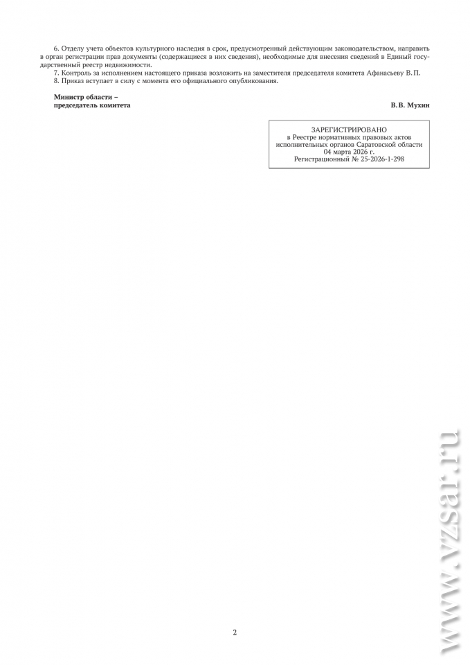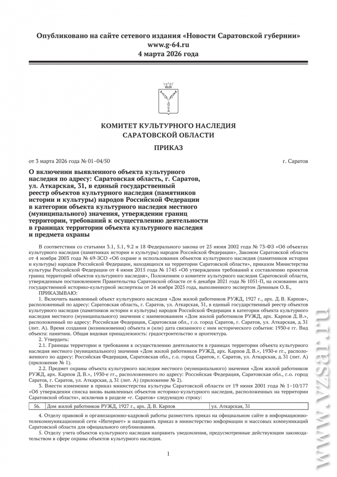 Вчера был опубликован соответствующий приказ подписанный министром области - председателем комитета культурного наследия Владимиром Мухиным.