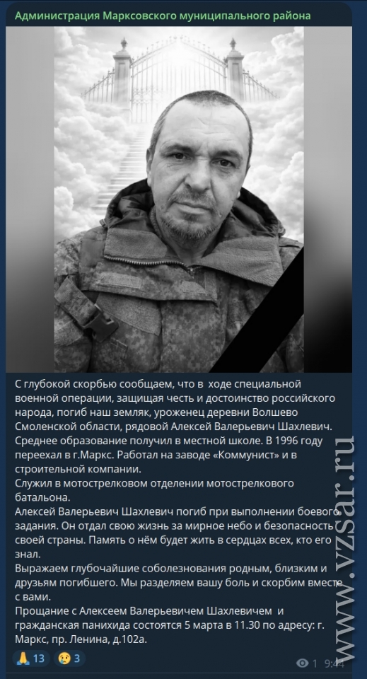 Также администрация Марксовского района рассказала, что сегодня в городе простились с Алексеем Шахлевичем.