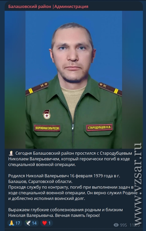 Администрация Балашовского района рассказала о прошедшем сегодня прощании с погибшим Николаем Стародубцевым.