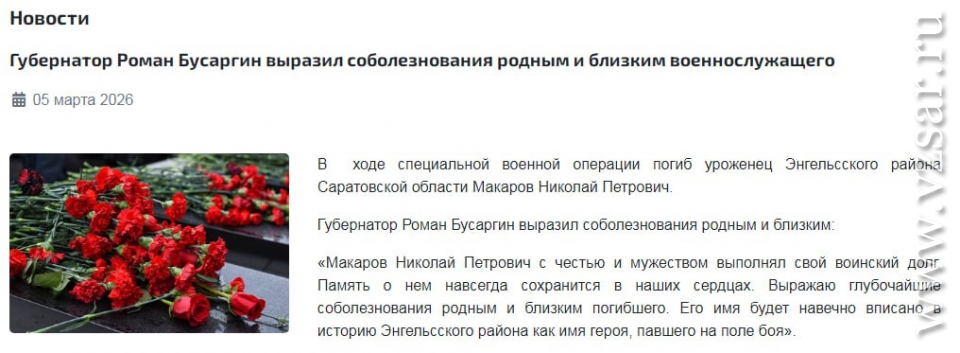 Администрация Энгельсского района без подробностей сообщила о гибели Николая Макарова.