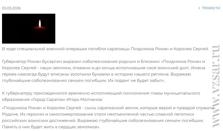 Администрация Саратова без подробностей сообщила о гибели Романа Позднякова и Сергея Королева.