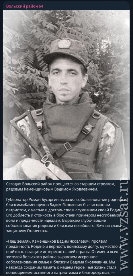 Администрация Вольского района рассказала, что сегодня в городе состоится прощание со старшим стрелком, рядовым Вадимом Каменщиковым.
