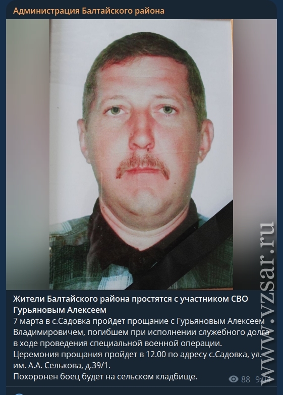 Также администрация Балтайского района рассказала, что завтра в селе Садовка пройдет прощание с погибшим Алексеем Гурьяновым.