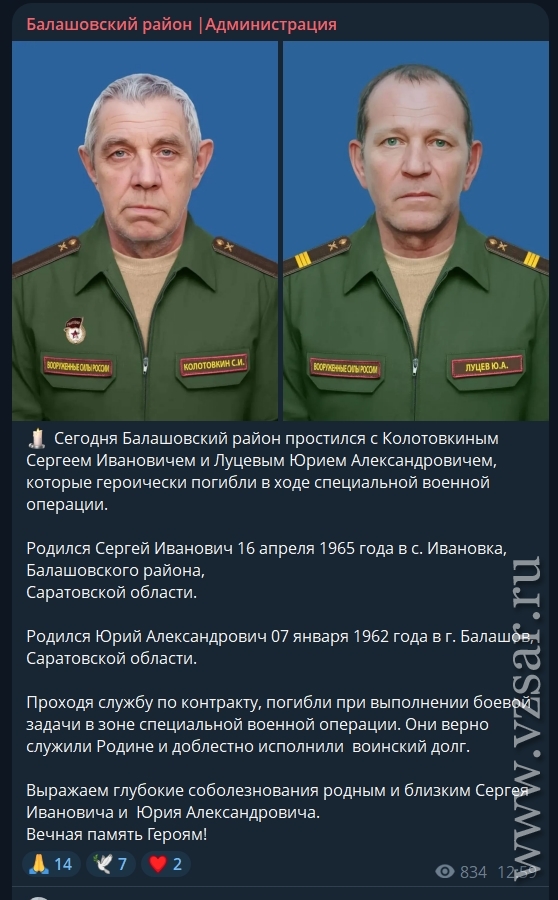 Администрация Балашовского района рассказала о сегодняшнем прощании с погибшими Сергеем Колотовкиным и Юрием Луцевым.