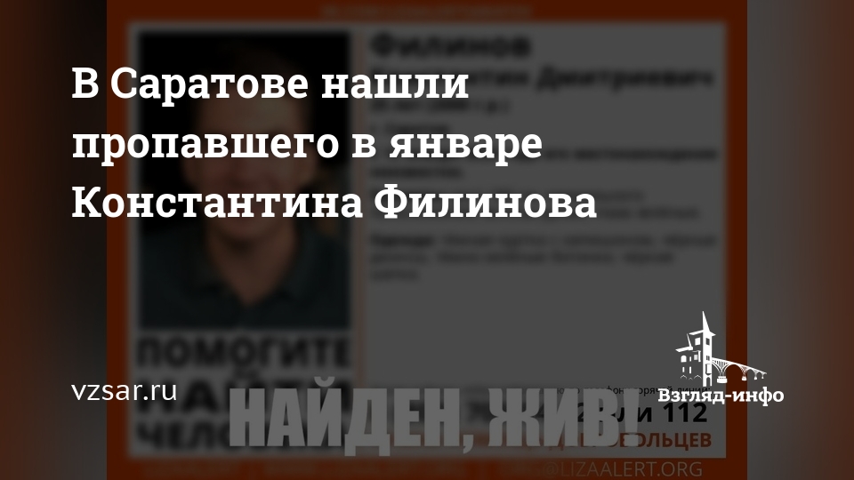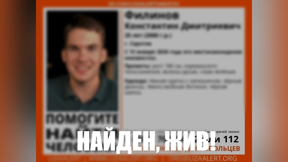 Пропавший без вести в Саратове 25-летний Константин Филинов найден живым. Об этом сообщает поисковый отряд "Лиза Алерт Саратов".