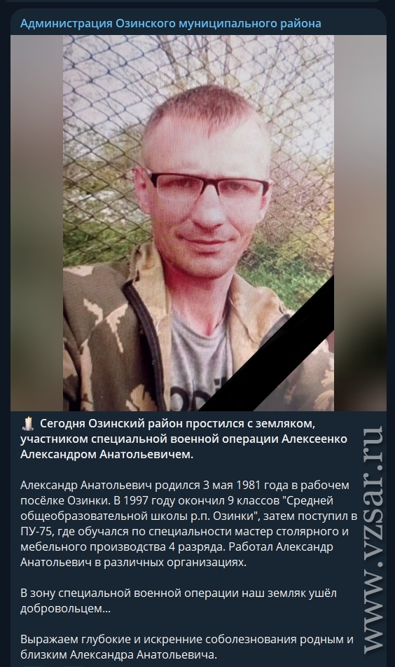 Также сегодня Озинский район простился с Александром Алексеенко, который родился 3 мая 1981 года в райцентре, окончил местные школу и профтехучилище.