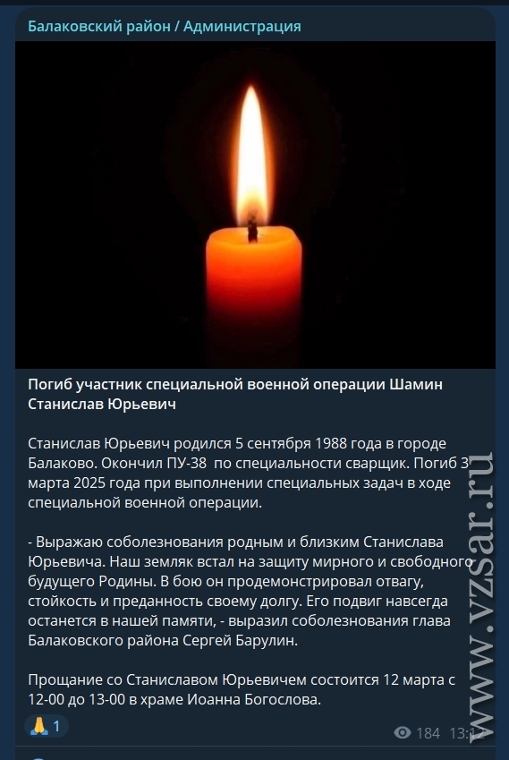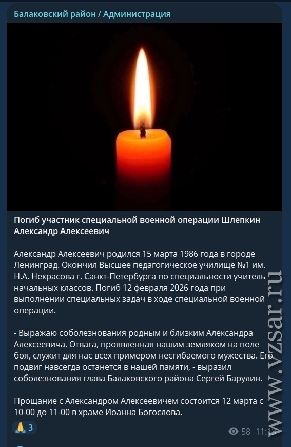 Также администрация Балаковского района рассказала, что завтра пройдет прощание с погибшими Александром Шлепкиным и Станиславом Шаминым.