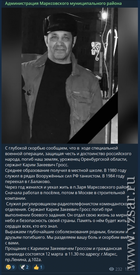 Администрация Марксовского района рассказала, что завтра в городе состоится прощание с сержантом Каримом Гроссом.