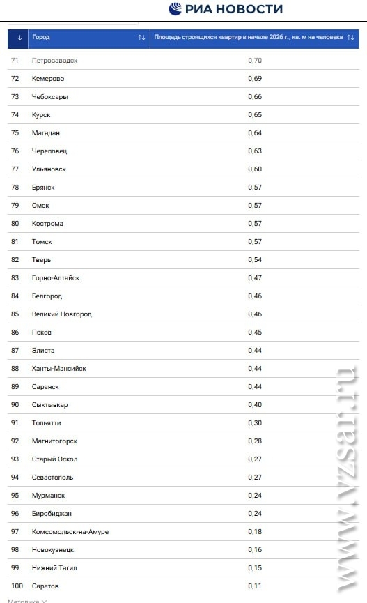 Напомним, вчера РИА Новости опубликовало исследование, в котором говорится, что самое последнее - 100-е по счету - место в рейтинге городов по площади строящегося жилья в начале 2026 года в многоквартирных домах на душу населения занял Саратов. Показатель составил 0,11 кв. метра на человека.